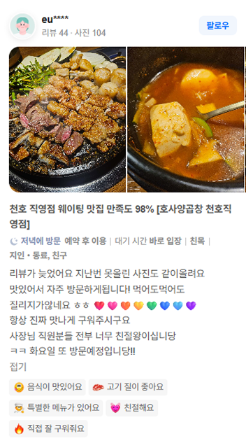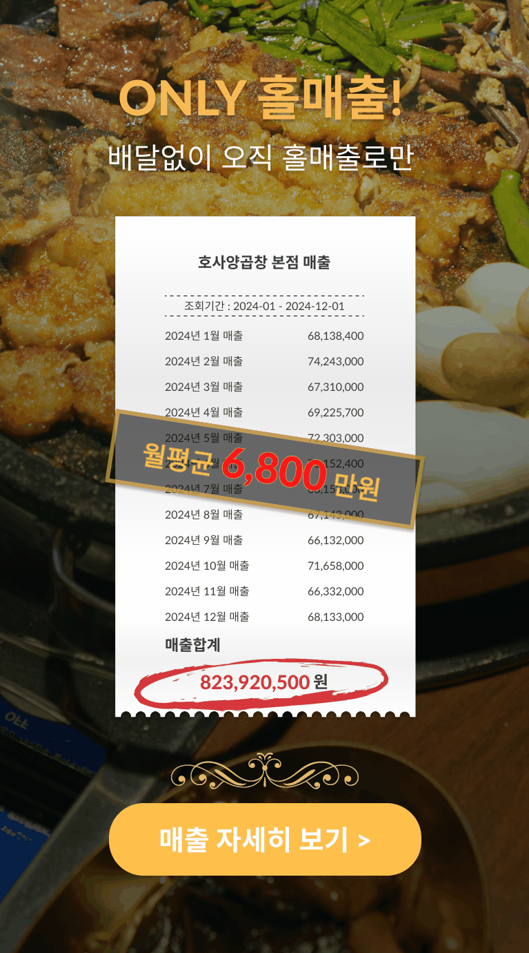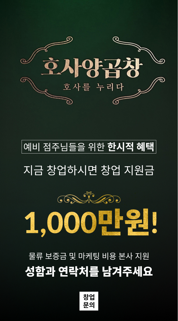 호사양곱창 | 대표 : 최목환 | 사업자등록번호 : 167-05-02039경기도 부천시 옥길로 110-25, 113호(옥길동 744-1)